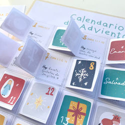 ![]() Formato 1: Así se ven las solapas al abrir. En su interior se encuentra la lectura Bíblica y el espacio para escribir la actividad del día. | ![]() Formato 2: Tarjetas colgadas y reforzadas en cartón (a elección). Al reverso se pegan las láminas con los versos bíblicos grandes. | ![]() Bitácora de Adviento para imprimir cuántas veces necesites. La idea es que los niños registren sus aventuras y aprendizajes de cada día. |
