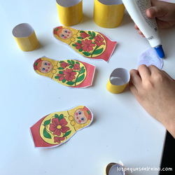 Para hacer estas muñecas utilizamos una impresión de las muñecas (que puedes descargar más abajo) que recortamos y después pegamos a diferentes cilindros hechos con cartulina. En total usamos 6 muñecas de diferentes tamaños y 6 trozos de cartulina también de diferentes tamaños, uno por cada muñeca. Luego pegamos como se puede ver en las imágenes de abajo y finalmente introducimos las muñecas una dentro de otra. ¡El resultado es muy hermoso!